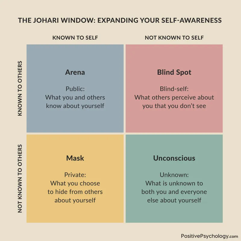 The Johari Window, is a model of self-awareness developed by psychologists Joseph Luft and Harry Ingram in 1955. It systemizes a way to track and examine your self-perceptions vs. how you may being perceived by others. But, in all cases, introspection should come first.
